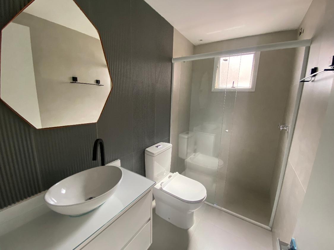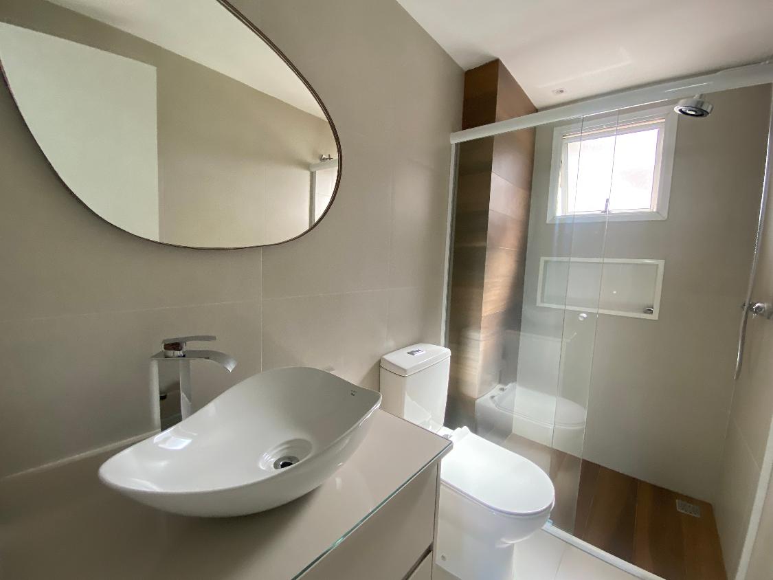 Banheiros espaçosos e com ventilação natural, armário de pia com cuba sobre exposta espelho e box blindex;