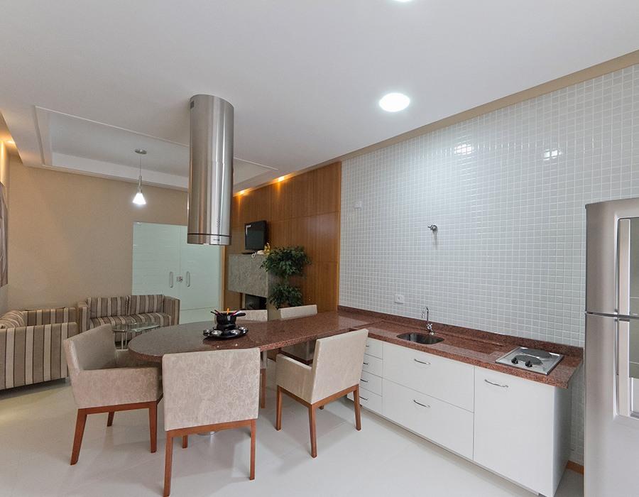 Living amplo integrado com cozinha e churrasqueira gourmet com churrasqueira a carvão, lavabo